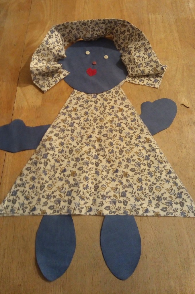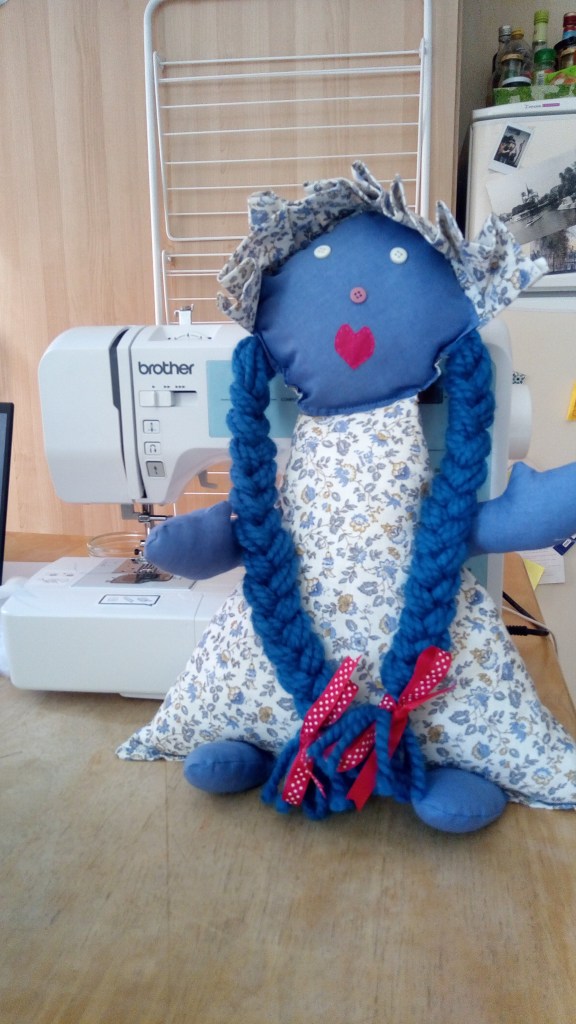 I had this flowery blue material and some wool for a scarf (that I am still making…very slowly!) I browsed a bit for inspiration and came up with my own pattern and creation. My main concerns were to have a sizable size doll that could double up as a cushion to hug.