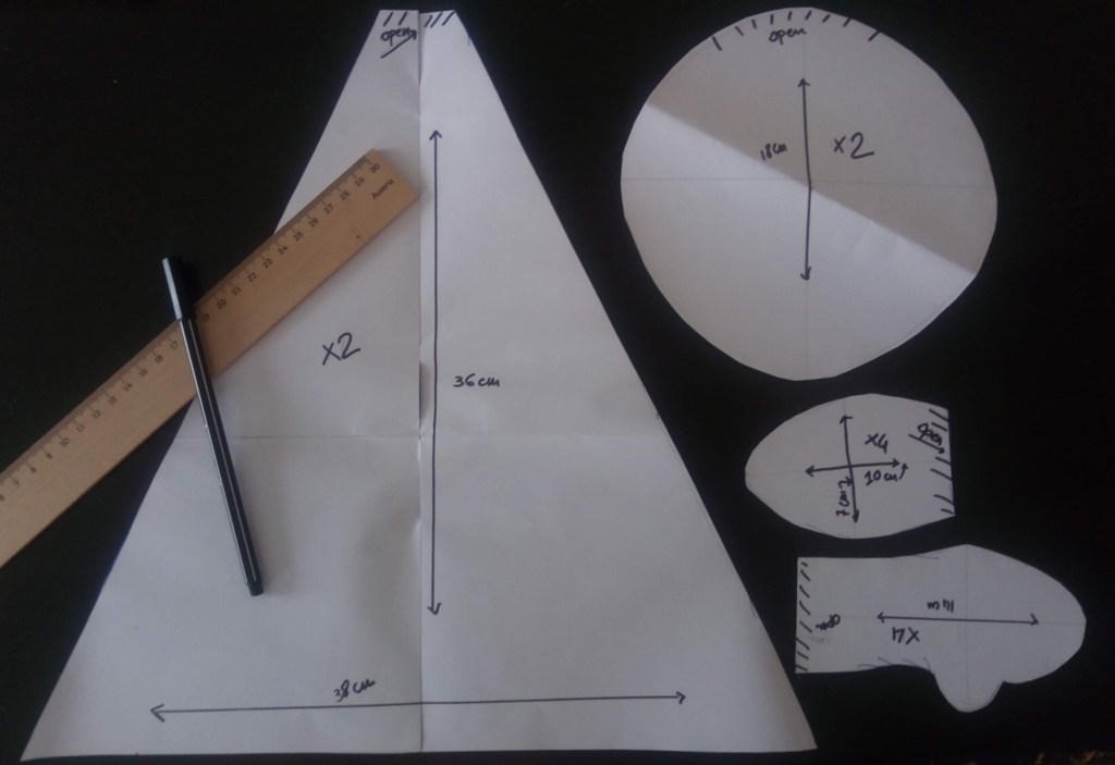 >Sew around the two triangles leaving the ‘open’ space + open holes for adding the feet and the hands. I just positioned them on the fabric and decided where I wanted them to sit.