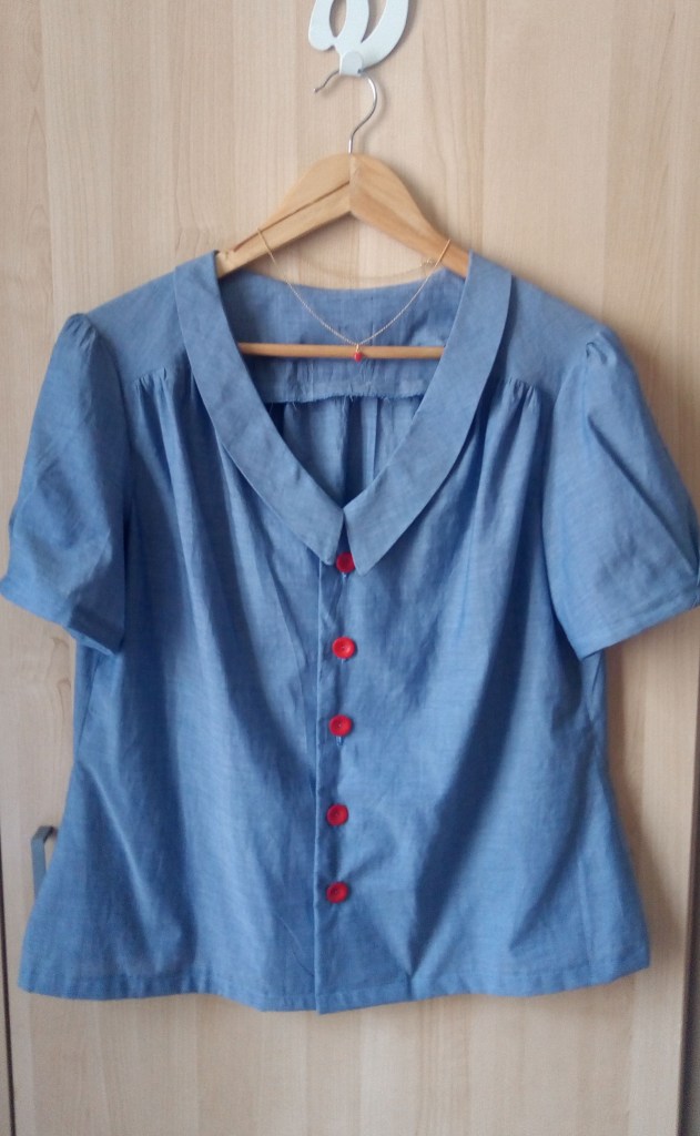 The pattern is a Tilly and the Buttons ‘Mimi’ shirt from the book ‘Love at first stitch’ (French version, I imagine the pattern names are different in English). The material is a very light and floaty cotton of a kind of shell blue-grey and the buttons are called ‘belly-buttons’ (they are concave) and are matte berry red.