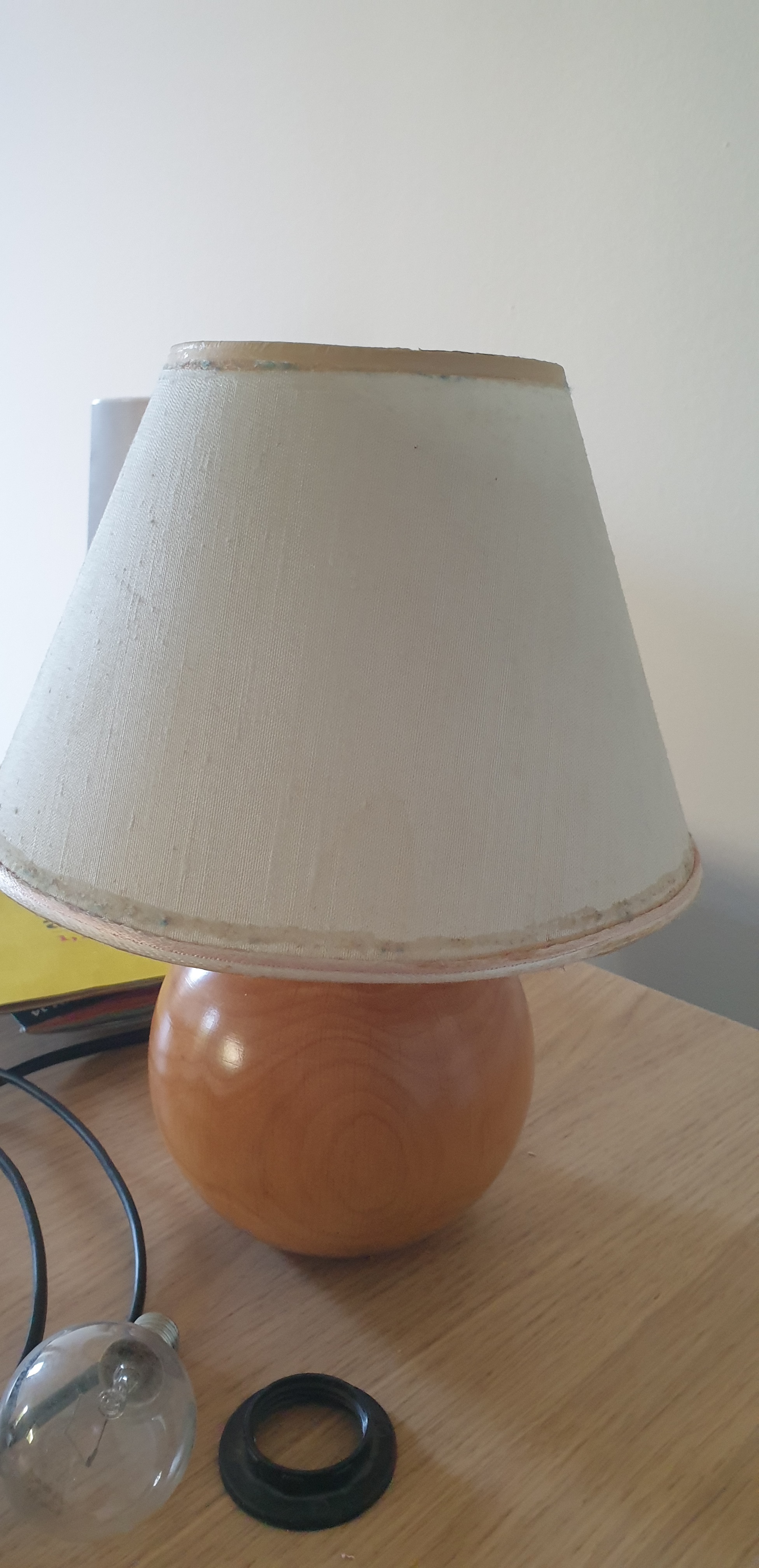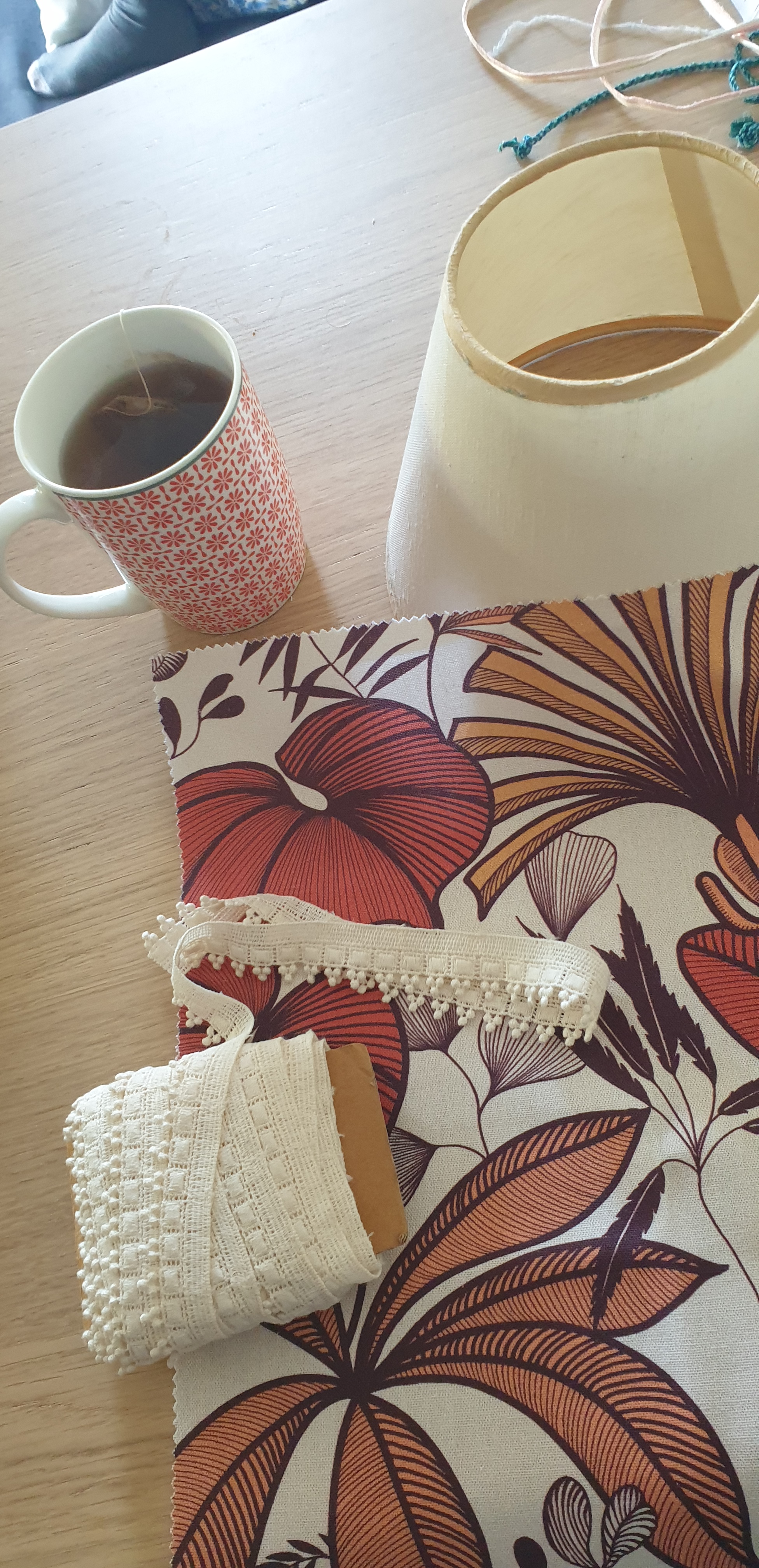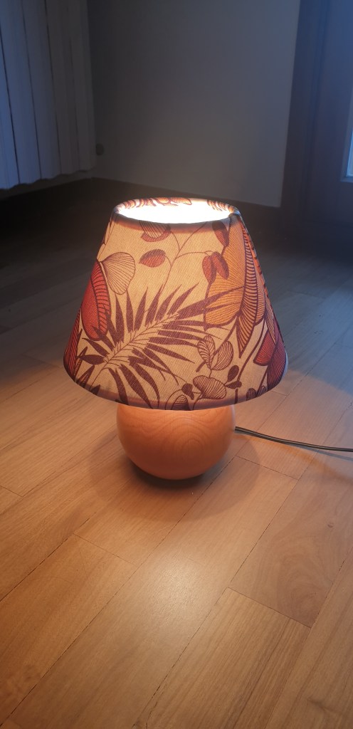 I glued the edges with hot glue, and trimmed along the edges, folding the material just over thr metal loop so that the raw edge is well glued out of way and gives a neat finish. Big thanks to Hearts and Sharts for the idea and underling the fact that you see a lamp also from above and having an ugly inside of the lamp…well means you still have an ugly lamp, only now it looks DIY!