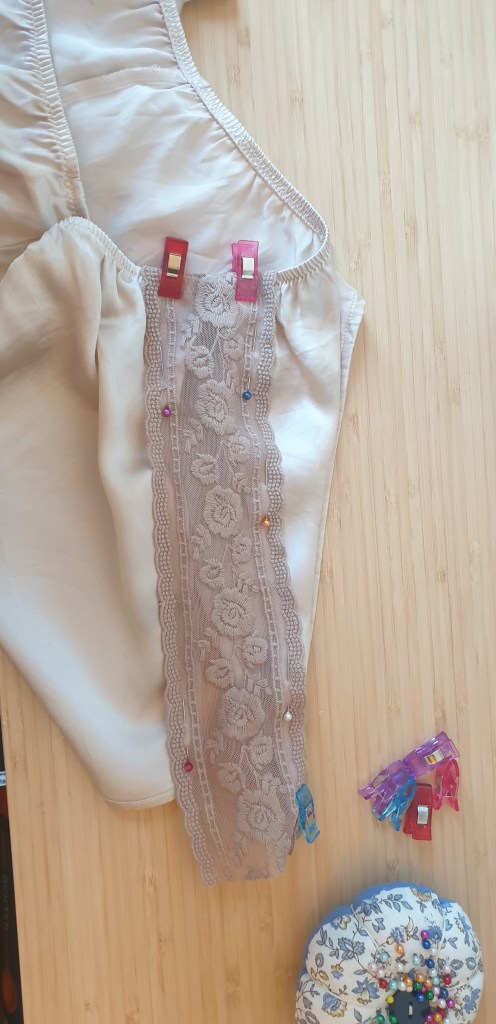 I left the elastic around the waist and the underarms strap. A bit like in my previous post for the making the black dress, I inserted the lace in the gap and stitched along the sides. It didn’t come out very even but putting the lace ontop covered it up nicely.